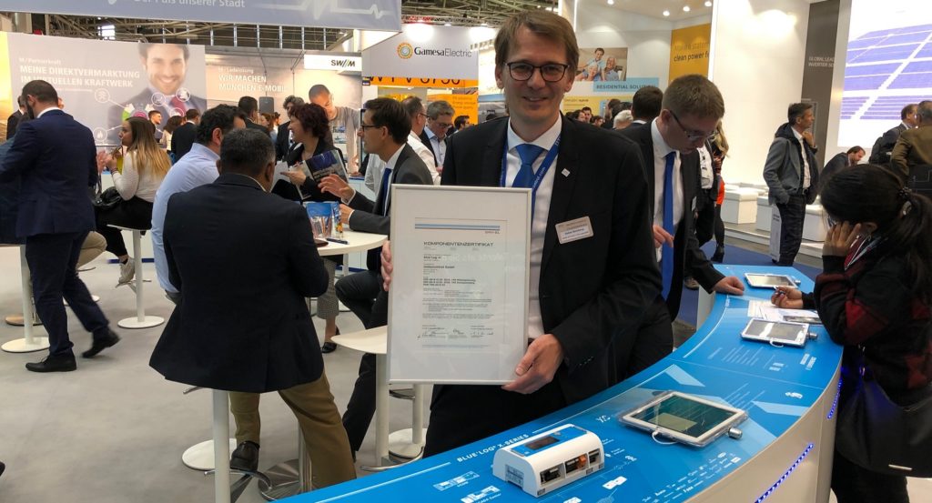 Das Messehighlight von Meteocontrol auf der Intersolar war leicht zu übersehen. Schließlich ist der neue Parkregler „blue Log XC“ kaum größer als eine Teeschachtel. Doch das kleine Gerät hat es in sich: Es ermöglicht nicht nur das Monitoring großer und kleiner Solarparks, es steuert auch die Einspeisung gemäß den Vorgaben des Netzbetreibers und folgt damit bereits den Anforderungen der neuen Richtlinien für die Mittel- und Hochspannung VDE-AR-N 4110 und VDE-AR-N 4120. Die Ingenieure des Photovoltaik-Unternehmens und der Leiter Produktmanagement Stefan Rensberg nahmen die entsprechende Zertifizierung von DNV-GL am vergangenen Mittwoch auf der Messe un München entgegen.