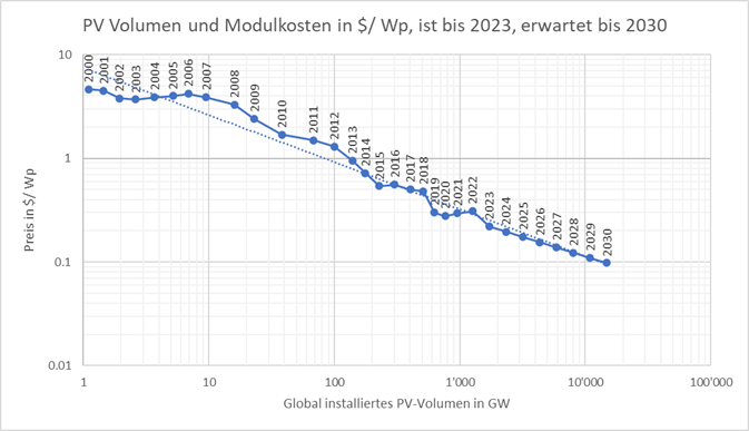Seit 48 Jahren hat sich das global das installierte Photovoltaik-Volumen etwa alle zwei Jahre verdoppelt. Gleichzeitig sank der Preis bei jeder Verdoppelung um rund 23 Prozent. Der Trend in Volumen und Preis erweist sich als sehr stabil mit geringer Volatilität.