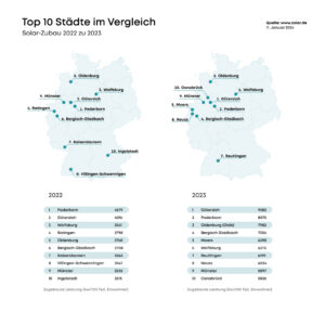 Auch mit Blick allein auf den Zubau in 2023 führen die beiden ostwestfälischen Kommunen wie auch im Jahr zuvor das Feld der 100 größten deutschen Städte an. So kamen in Gütersloh, gerechnet auf 100.000 Einwohner, im letzten Jahr private Anlagen mit einer Leistung von 9,4 Megawatt hinzu. In Paderborn waren es 8,6 Megawatt. Auf den weiteren Plätzen finden sich Oldenburg (8,0 Megawatt), Bergisch Gladbach (7,3 Megawatt) und Moers (6,3 Megawatt).