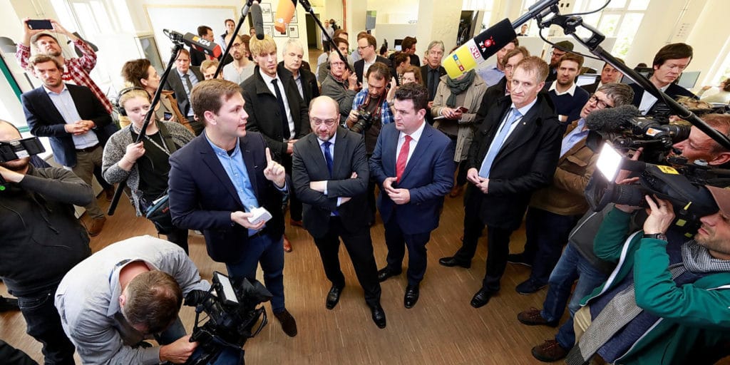 Warum kam Martin Schulz gerade ins Berliner Büro von Sonnen? Sie hätten gefragt und er sei gekommen, so Schröder. Bisher würden die Themen von Start-ups von der FDP vereinnahmt. „Wir sind parteiunabhängig, haben aber das Interesse, auch bei den Volksparteien Gehör zu finden“, sagt er. Das dürfte sich durchaus gelohnt haben. Publikumspresse und Fernsehen waren auch vor Ort und haben Schulz vor dem Sonnen-Logo zugehört.