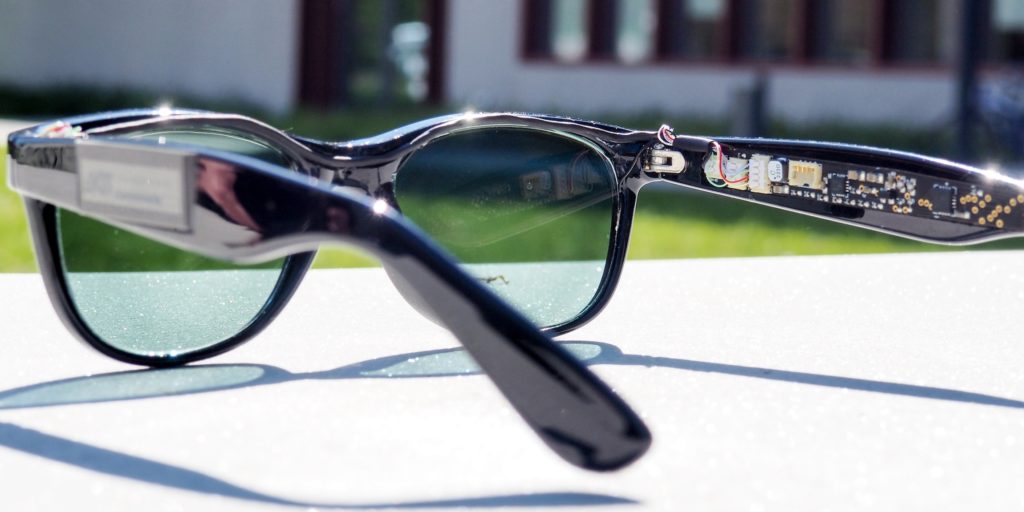 Dem KIT zufolge ist die Sonnenbrille mit einem Modell von der Stange nur kaum zu unterscheiden. Die Gläser seien jeweils 1,6 Millimeter dick und mit sechs Gramm ungefähr genauso schwer wie die Gläser einer herkömmlichen Sonnenbrille. In den Bügeln des handelsüblichen Kunststoffgestells befinden sich nach Angaben des Instituts jedoch ein Mikroprozessor und zwei Displays, auf denen die Sonnenstärke und Temperatur in einer Balkengrafik dargestellt werden.