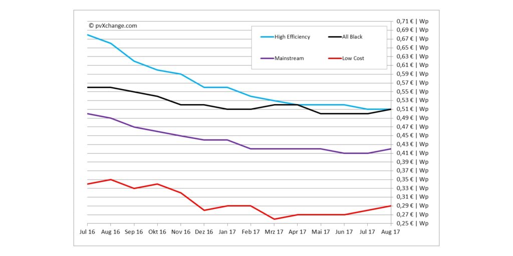 | Mainstream | 0,42 | + 2,4 % | Module mit üblicherweise 60-Zellen, Standard-Alurahmen, weißer Rückseitenfolie und 250 bis 275 Wp, repräsentieren den Großteil der Module im Markt |