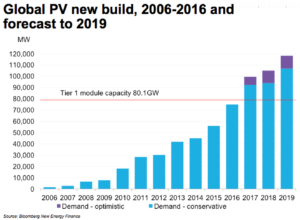 Der Nachfrage stehen die Produktionskapazitäten gegenüber. Insgesamt gibt es kristalline Modulfertigungskapazitäten von rund 122 Gigawatt, so Jenny Chase, Leiterin des Bereichs Solaranalyse bei Bloomberg. In 2018 wird weiter zugebaut und sie sieht nicht, dass es wegen fehlender Modulfertigungskapazitäten zu Angebotsengpässen kommen würde.