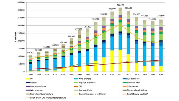 Mit 338.600 arbeitete 2016 knapp die Hälfte der insgesamt 690.000 Beschäftigten in der deutschen Energiewirtschaft im Bereich erneuerbare Energien. Nach 2011 ist die Zahl damit wieder erstmals wieder gestiegen, um rund 10.000 Beschäftigte, wie eine jüngst vom Bundeswirtschaftsministerium veröffentlichte Studie zeigt. Mit der Erstellung beauftragt waren das Deutsche Zentrum für Luft- und Raumfahrt (DLR), das Deutschen Instituts für Wirtschaftsforschung (DIW) und die Gesellschaft für Wirtschaftliche Strukturforschung. In der Photovoltaik hielt sich demnach die Beschäftigtenzahl 2016 bei um die 40.000. Zum Vergleich: Die Windenergie legte dagegen erneut zu und erreichte mit 160.000 Beschäftigten ein Allzeithoch.