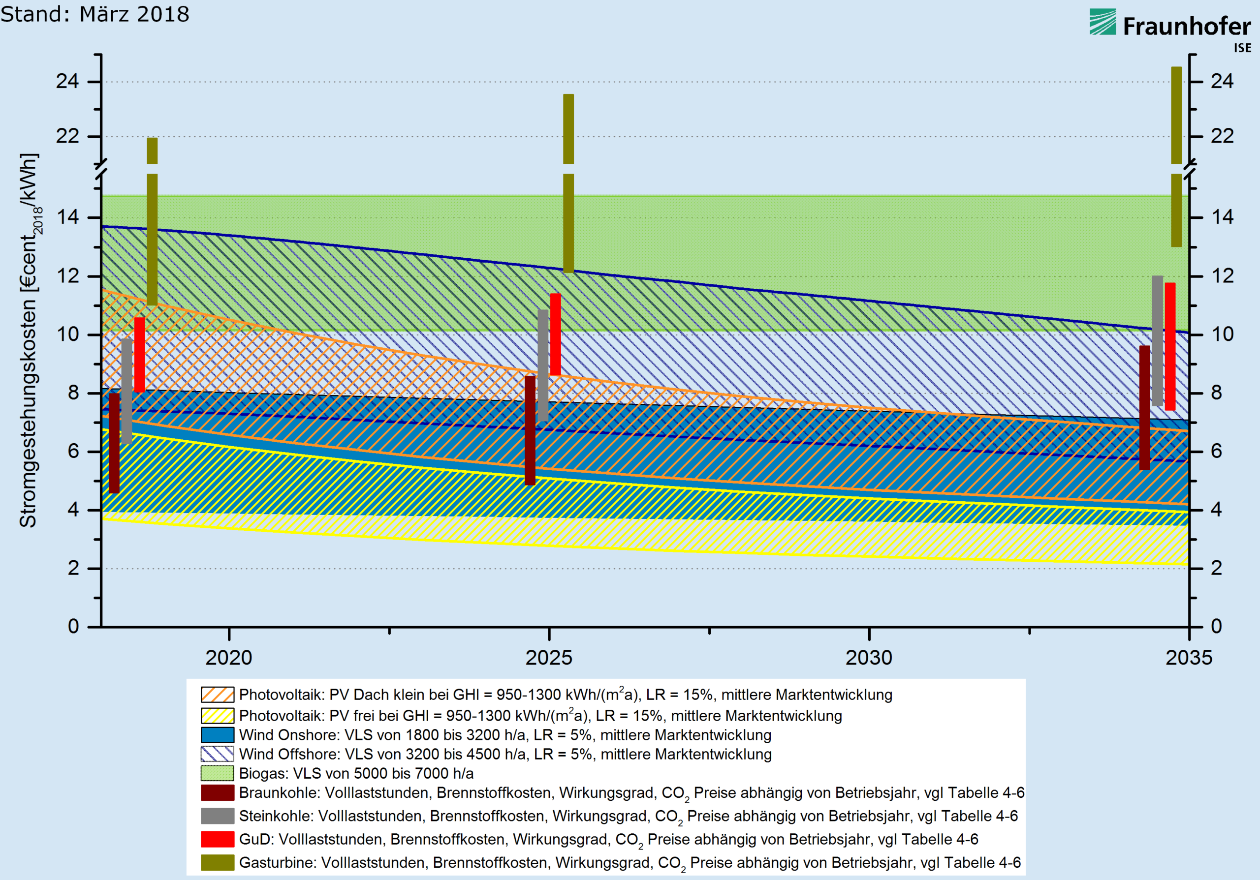 Der Studie zufolge werden die technologischen Entwicklungen in der Photovoltaik und Windkraft die Kosten künftig weiter stark senken. Photovoltaik-Freiflächenanlagen in Süddeutschland und Onshore-Windenergieanlagen an windreichen Standorten werden demnach bis 2035 die durchschnittlichen Stromgestehungskosten aller fossilen Kraftwerke deutlich unterbieten. So fielen ab 2030 die Stromgestehungskosten für Photovoltaik-Anlagen unter 4,7 Eurocent pro Kilowattstunde für Aufdachanlagen beziehungsweise 2,41 Eurocent pro Kilowattstunde für Freiflächenanlagen. Die spezifischen Anlagenkosten würden bis 2035 auf 350 bis 815 Euro pro Kilowatt sinken.