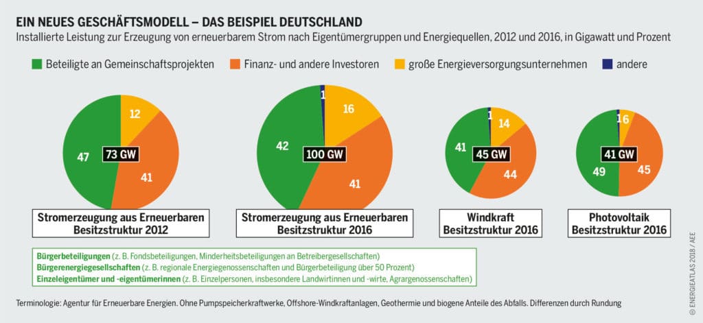In vielen Ländern hätten Bürger, Kommunen und Städte die Energiewende selbst in die Hand genommen, sagt Ueberschär. „Im Kern geht es bei der europäischen Energiewende auch um Demokratie, Teilhabe und soziale Gerechtigkeit.“ So bildet der Atlas beispielsweise auch die Besitzerstruktur in Deutschland im Bereich der Photovoltaik ab. Demnach waren im Jahr 2016 von den 41 Gigawatt an installierter Photovoltaik-Leistung 49 Prozent in Bürgerhand, 45 Prozent in Hand von Finanz- und anderen Investoren und sechs Prozent im Besitz von großen Energieunternehmen.