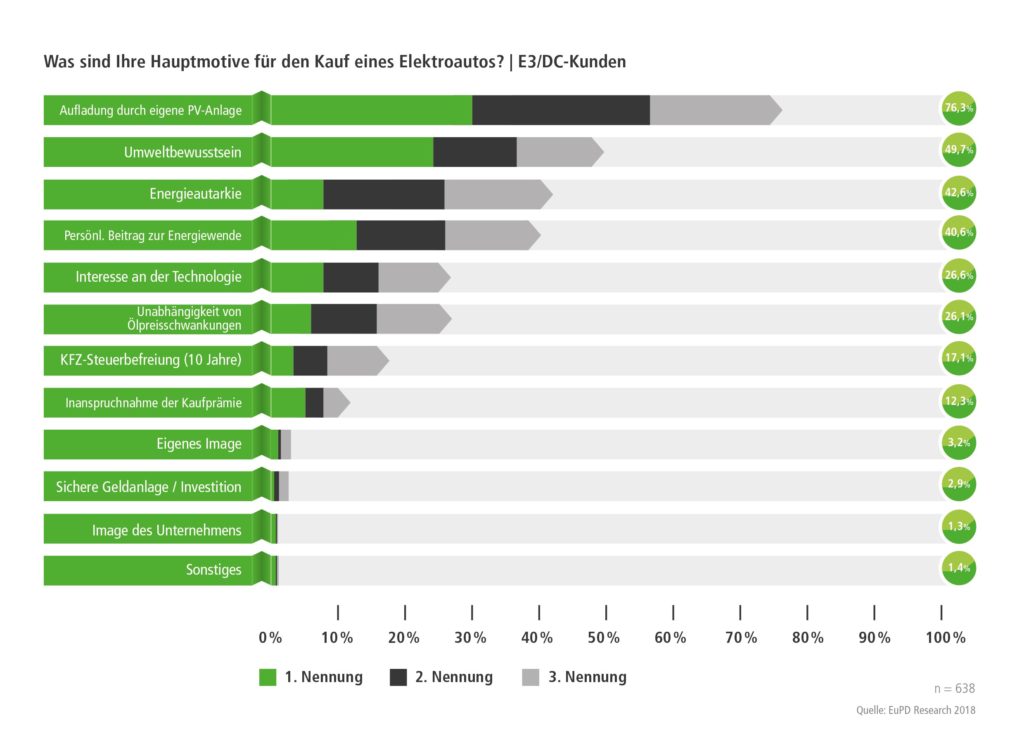 Für die Studie hat EuPD Research 1021 Hausbesitzen zu den Themen erneuerbare Energien, Elektromobilität und Wärme befragt. Es handelt sich dabei vor allem um Kunden des Speicherunternehmens E3/DC, aber nicht ausschließlich. Bei den Gründen, die derzeit noch gegen einen Kauf von Elektroautos sprechen, waren sich beide befragten Gruppen relativ einig. So müsse die Reichweite der Elektroautos erhöht werden, Preise müssten fallen und die Ladeinfrastruktur ausgebaut werden, so die wichtigsten Argumente, um doch in ein solches Fahrzeug zu investieren.