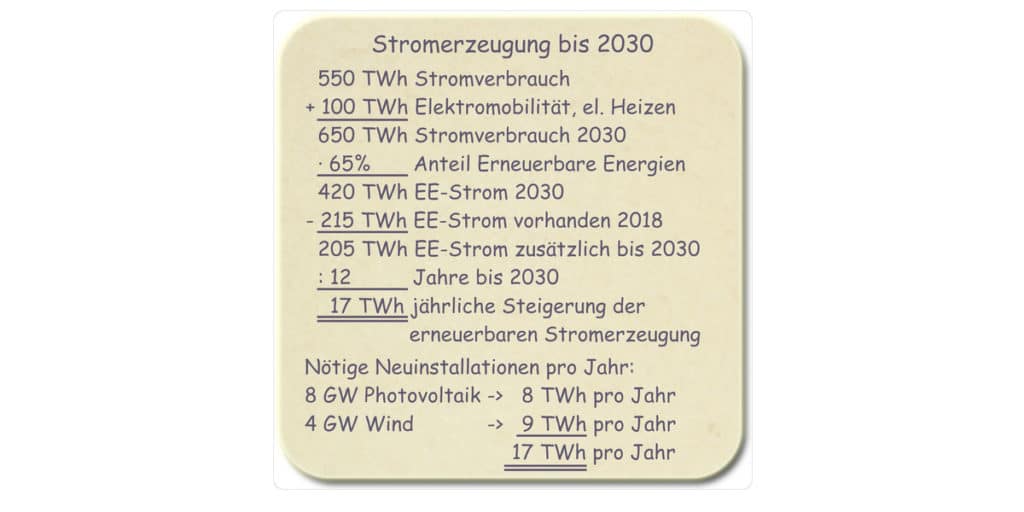 Man kann an dieser Bierdeckel-Rechnung so manches bekritteln (warum nur 100TWh für Elektromobilität und Heizen, warum einen so starken Schwerpunkt auf die PV, wo wir doch schon bisher mehr Wind- als PV-Leistung haben, gibt es nicht auch Effizienzsteigerungen ohne Reboundeffekt), aber das sind Details. Der große Bogen ist keine Milchmädchenrechnung, sondern der Weg, den man gehen muss, wenn man die großartig verkündeten Ziele auch erreichen will.