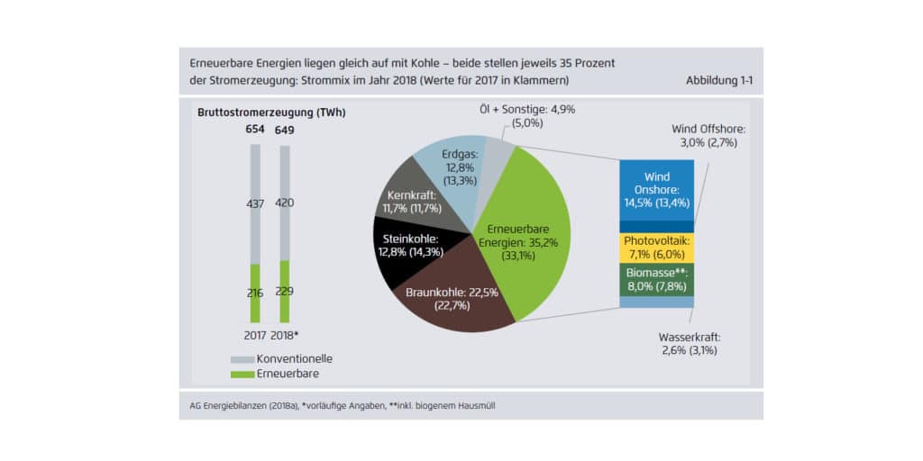 Erstmals haben in Deutschland erneuerbare Energien und Kohlekraftwerke genau so viel Strom produziert. Einen Anteil von 35,2 Prozent an der Stromerzeugung erreichten nach der Auswertung „Die Energiewende im Stromsektor: Stand der Dinge 2018“ von Agora Energiewende Photovoltaik, Windkraft und Co. einerseits sowie Braun- und Steinkohle andererseits. Beim Stromverbrauch hätten die Erneuerbaren sogar einen Anteil von 38,2 Prozent erreicht, wie der Berliner Think-Tank am Montag veröffentlichte. Die Differenz ergebe sich durch die Stromexporte, die leicht zurückgegangen seien, aber immer noch mit mehr als 50 Terawattstunden enorm hoch seien.