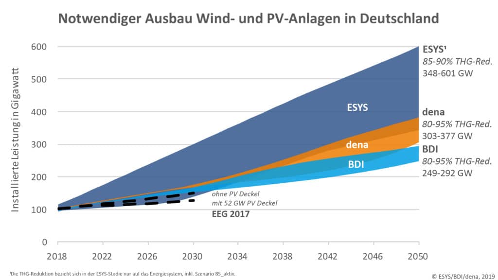 So fordern Akademien, BDI und Dena, den jährlichen Nettozubau der erneuerbaren Energien auf mindestens sechs Gigawatt zu steigern. Wie stark der Zubau konkret sein muss, um die Treibhausgas-Emissionen bis 2050 um 80 bis 95 Prozent zu reduzieren – darin unterscheiden sich Grundsatzstudien allerdings. ESYS fordert bis 2050 (für eine Reduktion um 85 bis 90 Prozent) 348 bis 601 Gigawatt, Dena 303 bis 377 Gigawatt, BDI 249 bis 292 Gigawatt. Heute sind rund 120 Gigawatt installiert. Nimmt man zum Beispiel einen nötigen Zubau auf 350 Gigawatt an, müssen jährlich fast elf Gigawatt Leistung dazu kommen.