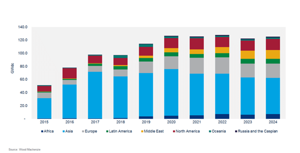 Die Zugmaschine für das Anwachsen der jährlichen Nachfrage werden Länder sein, die jährlich zwischen einem und fünf Gigawatt neu installieren, wie es weiter hieß. 2018 fielen gerade einmal sieben Länder in diese Kategorie. 2022 werden es 19 sein, darunter auch Frankreich, Saudi-Arabien und Taiwan. Doch auch für die derzeitige Nummer zwei und drei beim Photovoltaik-Zubau – Indien und die USA – sehen die Analysten gute Perspektiven. So würden in Indien die Ausschreibungsaktivitäten wieder an Fahrt aufnehmen. In den USA gebe es zudem vielversprechende Zubauankündigungen von Energieversorgern. Auch für Europa bestätigt Wood Mackenzie ein starkes Wachstum, gerade mit Blick auf die Erneuerbaren-Ziele für 2020 und 2030 in den verschiedenen Ländern. Die wohl aufregendste Entwicklung in Lateinamerika sei in Brasilien zu erwarten. Auch im Nahen Osten sehen die Analysten viel Potenzial, etwa in der bevorstehenden 1,5-Gigawatt-Ausschreibung in Saudi-Arabien.