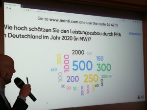 Wie stark sich der PPA-Markt in Deutschland kurzfristig entwickeln wird, auch darüber herrschte auf dem Strommarkt-Symposium in Berlin eine stark unterschiedliche Auffassung. Auf die Frage, wie hoch der Zubau durch Photovoltaik-PPA-Projekte im kommenden Jahr sein werde, gaben die Teilnehmer Schätzungen zwischen 10 und 3000 Megawatt (siehe Screenshot) ab. Welche Erwartungen Sie an den Zubau in den Jahren zwischen 2020 und 2030 haben, war die nächste Frage. Der Durchschnittwert für neu installierte Photovoltaik-Anlagen lag dabei bei 34,2 Gigawatt und für neue Windparks an Land bei 24,9 Gigawatt.