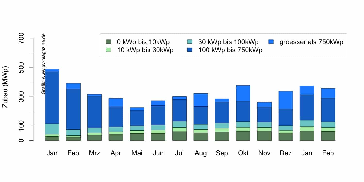 Nach den Angaben der Bundesnetzagentur lag der Photovoltaik-Zubau im Februar in Deutschland bei 356,71 Megawatt. Damit blieb die Zahl der neu gemeldeten Photovoltaik-Anlagen nur knapp hinter dem Wert von Januar zurück, die eine kumulierte Leistung von knapp 374 Megawatt erreichten.