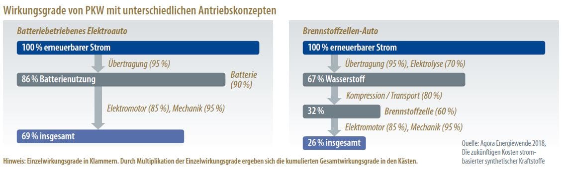 „In einer umfangreichen Studie von Agora Energiewende mit Fassung 3/2018 kommt ein BEV zu einem Wirkungsgrad von 69% und ein FCEV zu 26% (Faktor 2,8). Die geht aber von 70% el. Wirkungsgrad des Elektrolyseurs aus und berücksichtigt die Wärmenutzung nicht. Geht man aber von derzeit machbaren 85% el. Wirkungsgrad aus. Kommt man schon auf 32% statt 26% (Faktor 2,2). Berücksichtigt man noch die Wärmenutzungsmöglichkeit von 5-10% durch Sektorenkopplung und berücksichtigt man noch die Wärmenutzung im Fahrzeug (Winter), dann kommt man nur noch auf 40-50% Mehrverbrauch an Energie. Berücksichtigt man dann noch den Energieverbrauch bei der Herstellung (Akku vs. Brennstoffzelle), dann hat sich das Thema Energieverschwendung in Luft aufgelöst. Sie sehen man muss in Gesamtzusammenhängen denken und bewerten.“