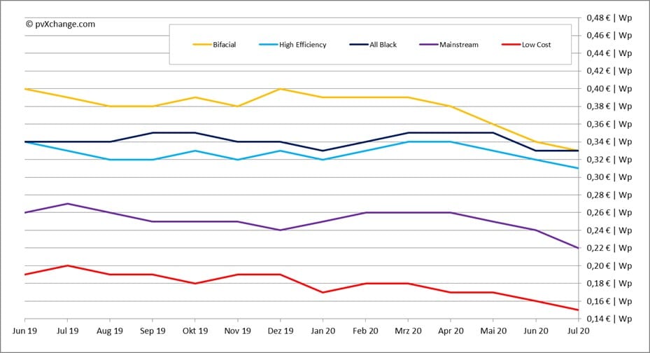 Zunächst aber ein Blick auf die Modulpreisentwicklung: der in den vergangenen Monaten einsetzende allgemeine Preisverfall geht vorerst weiter – Preiserleichterungen im oberen einstelligen Prozentbereich sind über alle Technologien hinweg bemerkbar. Die Nachfrage im europäischen Markt ist zwar stabil bis wachsend, doch gibt es vielerorts noch großvolumige Restposten, die sich durch Corona-bedingte Verzögerungen in der Projektrealisierung aufgestaut haben und erst langsam wieder abfließen. Die zu Quartalsende üblichen Lagerbereinigungen führten zu Preissenkungen an breiter Front, die auch zu Anfang des zweiten Halbjahres noch immer den Markt bestimmen. Hersteller und Händler unterbieten sich gegenseitig bei kurzfristig verfügbarer Lagerware, um Platz für neue Lieferungen zu machen.
