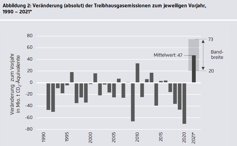 Für seine Schätzungen hat Agora Energiewende den Mittelwert aus einem Minimal- und einem Maximal-Szenario als Grundlage genutzt. Die Unter- und Obergrenze der für 2021 zu erwartenden Mehremissionen liegt demnach zwischen 20 und 73 Millionen Tonnen CO2. Insgesamt dürfte Deutschland damit auf 760 bis 812 Millionen Tonnen CO2-Emissionen in diesem Jahr kommen, was einer Reduktion zwischen 35 und 39 Prozent gegenüber 2020 entspricht – also das Klimaziel 2020 wäre in jedem Szenario verfehlt. 2020 hatte Deutschland insgesamt 739 Millionen Tonnen CO2 emittiert, was einer Redaktion von 40,8 Prozent entsprach.