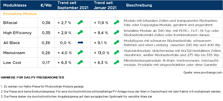 Zu Anfang gleich die erste schlechte Nachricht: auch die Modulpreise tragen zum weltweiten Anstieg der Inflationsrate bei. Nach einer sehr kurzen Verschnaufpause ziehen die Preise bei fast allen Modultechnologien wieder an. Allerdings spiegeln die für Anfang Oktober erfassten Veränderungen noch lange nicht die noch zu erwartenden Preissteigerungen wieder. Zum Zeitpunkt der Preiserhebung wurden von einigen Photovoltaik-Herstellern für kommende Lieferungen bereits noch deutlichere Korrekturen nach oben angekündigt. Die im Oktober-Index dargestellte Preiskorrektur ist also nur der zaghafte Beginn eines Anstiegs um nicht weniger als 15 bis 20 Prozent gegenüber dem Preisniveau, welches noch vor wenigen Wochen gegen Ende des dritten Quartals Bestand hatte. Dies wird dann aber wohl die letzte Preiskorrektur sein, mit der auf Herstellerebene bis zum Ende des Jahres zu rechnen ist. Natürlich kann es im Spotmarkt auf Basis von Angebot und Nachfrage nochmals Ausschläge nach oben oder unten geben. An den Abgabepreisen der Produzenten an Projektgesellschaften und Distributoren wird sich nach dieser satten Preiserhöhung in der zweiten Oktoberhälfte wohl nichts mehr ändern.