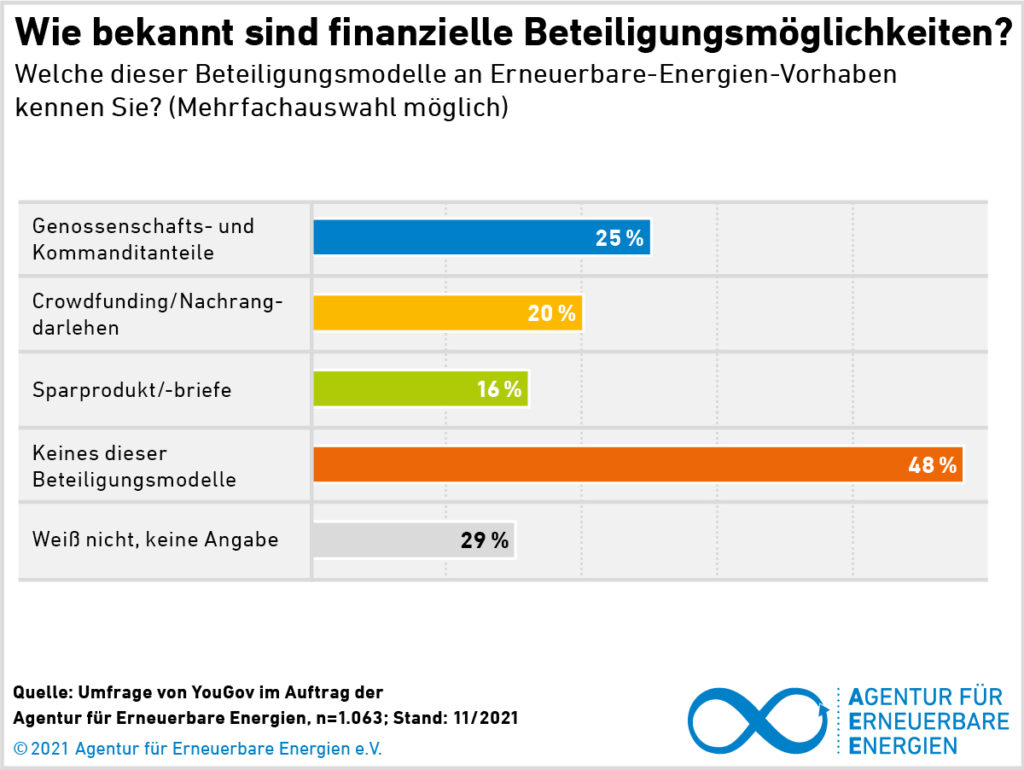 Doch nicht nur eigene Erfahrungen können helfen, die Akzeptanz zu steigern. Auch eine finanzielle Beteiligung der Menschen fördert die Zustimmung, wie die AEE-Umfrage steigt. Zwar geben 48 Prozent der Befragten an, dies habe keinen Einfluss auf ihre Haltung, doch für 9 Prozent ist es auf jeden Fall akzeptanzfördernd, für 16 Prozent trifft dies eher zu. Mehr als ein Viertel der Befragten machen allerdings auch keine Angaben. Dies könnte auch daran liegen, dass sie nur wenig über Beteiligungsmodelle wissen. Knapp die Hälfte der Befragten kennen weder die Beteiligung über Genossenschaften noch über Crowdfunding oder Sparbriefe, wie die Ergebnisse zeigen.