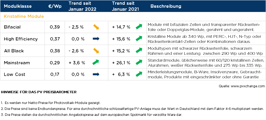 Bei den Modulpreisen scheint der Drei-Jahres-Peak nun überschritten zu sein. Wie die Corona-Zahlen in Deutschland, so sinken auch die Preise insbesondere für Projektmodule langsam, aber kontinuierlich wieder. Bei größeren Abnahmemengen können Module der Leistungsklassen oberhalb 400 Watt vereinzelt durchaus wieder unter der 26-Eurocent-Marke gebucht werden. Die Lieferung erfolgt dann in der Regel frühestens ab April oder Mai, denn kurzfristig verfügbare Ware, die noch zu höheren Kosten produziert und transportiert werden musste, wird momentan auch noch zu deutlich höheren Preisen gehandelt. Das ist der Grund, warum der Preisindex diese Entwicklung noch nicht richtig abbildet. Hier bewegen wir uns bei den leistungsstarken Modultypen noch im Bereich deutlich oberhalb 30 Eurocent pro Wattpeak. Der Preisanstieg der vergangenen Monate ist zwar zum Stillstand gekommen, ein echter Abwärtstrend ist zu diesem Zeitpunkt jedoch noch nicht erkennbar.