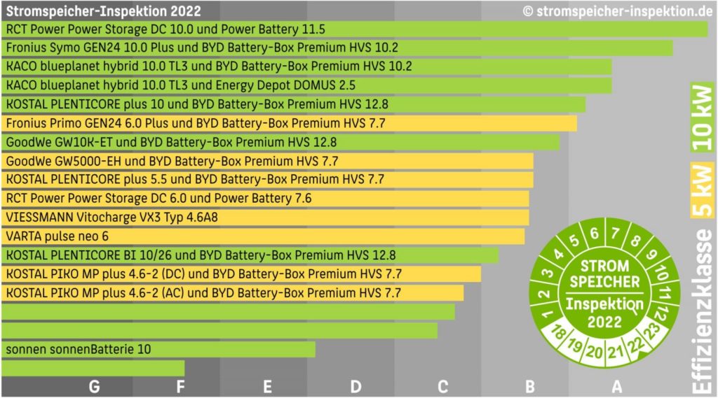 Nach der HTW Stromspeicher-Inspektion ist vor der HTW Stromspeicher-Inspektion: Für die sechste Auflage können sich Speicherhersteller mit ihren Systemen bis Mitte Dezember 2022 beteiligen. Die Hersteller können sich dabei nach Sichtung der Ergebnisse noch gegen eine namentliche Veröffentlichung entscheiden. In diesem Jahr ließen 12 von 14 Hersteller die Ergebnisse für ihre Systeme publizieren. Bei den öffentlichen Daten zeigt sich, dass die „Sonnenbatterie 10“ von Sonnen die geringsten Werte aufwies, und nur die Effizienzklasse D erreichte.