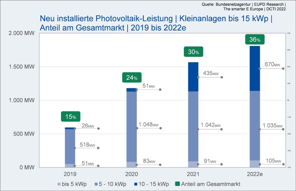 Private Haushalte setzen zunehmend auf Photovoltaik. Im vergangenen Jahr erreichten die Installationen von Photovoltaik-Anlagen bis 15 Kilowatt Leistung ein Gesamtvolumen von 1,6 Gigawatt, wie EUPD Research am Donnerstag veröffentlichte. Für dieses Jahr gehen sie von einem weiteren Anstieg der Nachfrage auf dann insgesamt 1,8 Gigawatt aus. Besonders stark wachse dabei das Segment zwischen 10 und 15 Kilowatt Leistung, dagegen stagniere der Zubau bei den Anlagen zwischen 5 und 10 Kilowatt. Auch am Gesamtmarkt wird sich der Anteil der Kleinanlagen weiter erhöhen. 2021 machten sich EUPD Research zufolge rund 30 Prozent aus. Für dieses Jahr werde ein Zubauanteil von 36 Prozent erwartet.