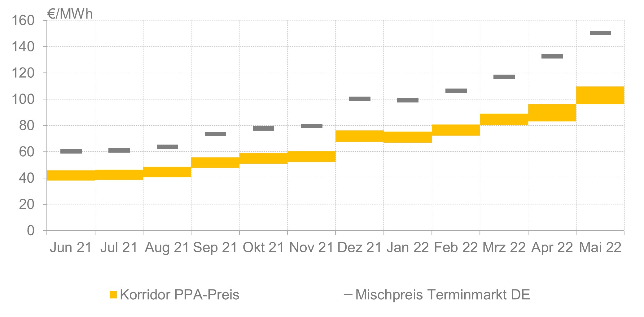 Im Mai 2022 sind die Preise für Strom im Terminmarkt ausgehend von dem bereits außergewöhnlich hohen Niveau nochmals weiter angestiegen. Insbesondere galt dies auch für die mittel- und langfristigen Jahre. Auf dieser Basis ist das gemittelte Terminpreisniveau für Strom als Benchmark für unseren PPA-Price-Tracker im Mai 2022 weiter geklettert und lag bei rund 150 Euro pro Megawattstunde für den 10-jährigen Betrachtungshorizont. Dies stellt den Preisbenchmark für langfristige Power Purchase Agreements im deutschen Strommarkt dar – wenn auch im PPA-Markt eine gewisse Zunahme von Risikoabschläge aufgrund des hohen Preisniveaus und der Volatilität zu beobachten ist.