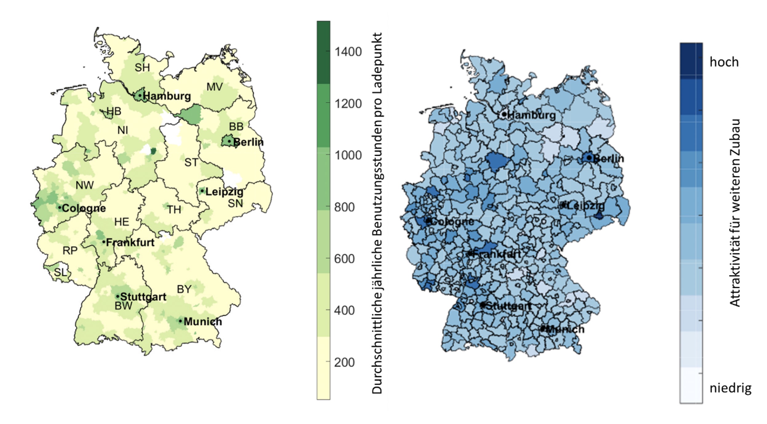 Abbildung 2: Durchschnittliche jährliche Belegungsdauer von Ladepunkten nach Kreis in Stunden pro Jahr (links, Quelle) und Attraktivität als Standort für neue Ladestationen (rechts, Quelle). Dunklere Farben bedeuten, dass in einem Landkreis mehr Stunden pro Jahr ein Fahrzeug lädt (links) bzw. eine neue Ladestation auf Basis der direkten Umgebung mehr Umsatz erwarten wird (rechts).