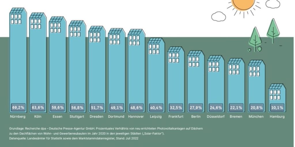 Nürnberg ist die neue Photovoltaik-Metropole und löst im alljährlichen Lichtblick „Solarcheck“ Essen ab. Der Ökostromanbieter untersucht die 14 Großstädte mit mehr als 500.000 Einwohnern auf ihre Photovoltaik-Nutzung und kommt dabei auf enorme Unterschiede. Nürnberg weist demnach einen Solar-Faktor von 69,2 Prozent auf – 2021 waren es noch 44,3 Prozent. Köln belegt wie schon im Vorjahr Platz zwei und erreicht 63,6 Prozent. Der Vorjahressieger Essen rutscht mit 59,6 Prozent auf Platz drei ab, wie Lichtblick am Montag veröffentlichte.