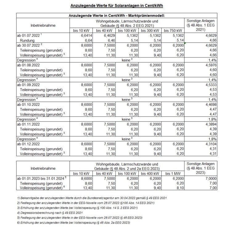 Die Solarförderung sinkt für sonstige Anlagen und Freiflächenanlagen bis 750 Kilowatt im Dezember nochmals um 1,8 Prozent. Der anzulegende Wert reduziert sich damit für diese Anlagen auf 4,31 Cent pro Kilowattstunde. Ab Januar 2023 steigt er nach dem neuen EEG dann auf 7,00 Cent pro Kilowattstunde. Für Photovoltaik-Dachanlagen gelten bereits seit dem 31. Juli die neuen Tarife nach dem EEG 2023 (siehe Tabelle). Somit gilt auch schon die Unterscheidung zwischen der Vergütung für Teil- und Volleinspeisung. Der Zuschlag für Photovoltaik-Mieterstrom bewegt sich im Dezember je nach Größe der Anlagen zwischen 1,7 und 2,72 Cent pro Kilowattstunde.
