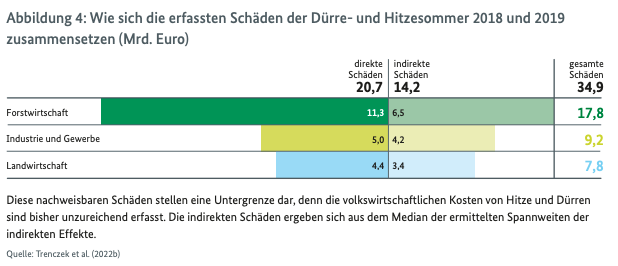 Für die Flut im Ahrtal 2021 errechnet die „Klimawirkungs- und Risikoanalyse 2021 für Deutschland“ einen Gesamtschaden von rund 40 Milliarden Euro. Damit war es das schadenträchtigste Extremereignis in der Geschichte der Bundesrepublik. Die Schäden der Hitzesommer 2018 und 2019 belaufen sich auf circa 35 Milliarden Euro. Die volkswirtschaftlichen Schäden des Klimawandels gehen dabei weit über die direkten Schäden hinaus. Lieferverzögerungen durch beschädigte Infrastrukturen oder eine verminderte Produktivität von Arbeitnehmern durch Hitzebelastungen stellen ebenfalls wichtige Faktoren dar, die bei der Schätzung der Schäden miteinbezogen werden müssen, so die Studie.