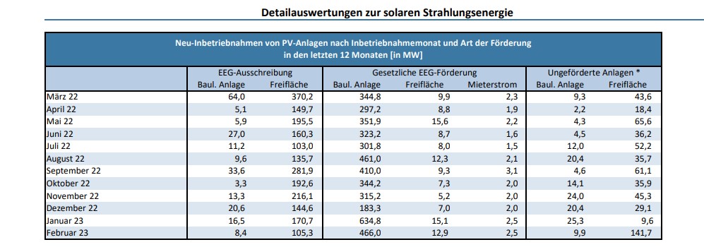 Dafür sind im Februar weniger Photovoltaik-Anlagen mit Zuschlägen aus den Ausschreibungen realisiert worden. Die Behörde gibt 105,3 Megawatt für Freiflächen- und 8,4 Megawatt für Dachanlagen in diesem Segment aus. Im Januar waren allein mehr als 170 Megawatt an Freiflächenanlagen aus den Ausschreibungen ans Netz gegangen. Bei den Photovoltaik-Anlagen, die über eine gesetzliche EEG-Förderung realisiert werden, weist die Statistik 466 Megawatt für Dachanlagen, 12,9 Megawatt für Freiflächenanlagen und 2,5 Megawatt für Photovoltaik-Mieterstrom aus. Im Januar lag die Gesamtleistung der neuen Dachanlagen noch bei 634,8 Megawatt. Der Rückbau von Photovoltaik-Anlagen betrug im Januar 0,9 Megawatt.