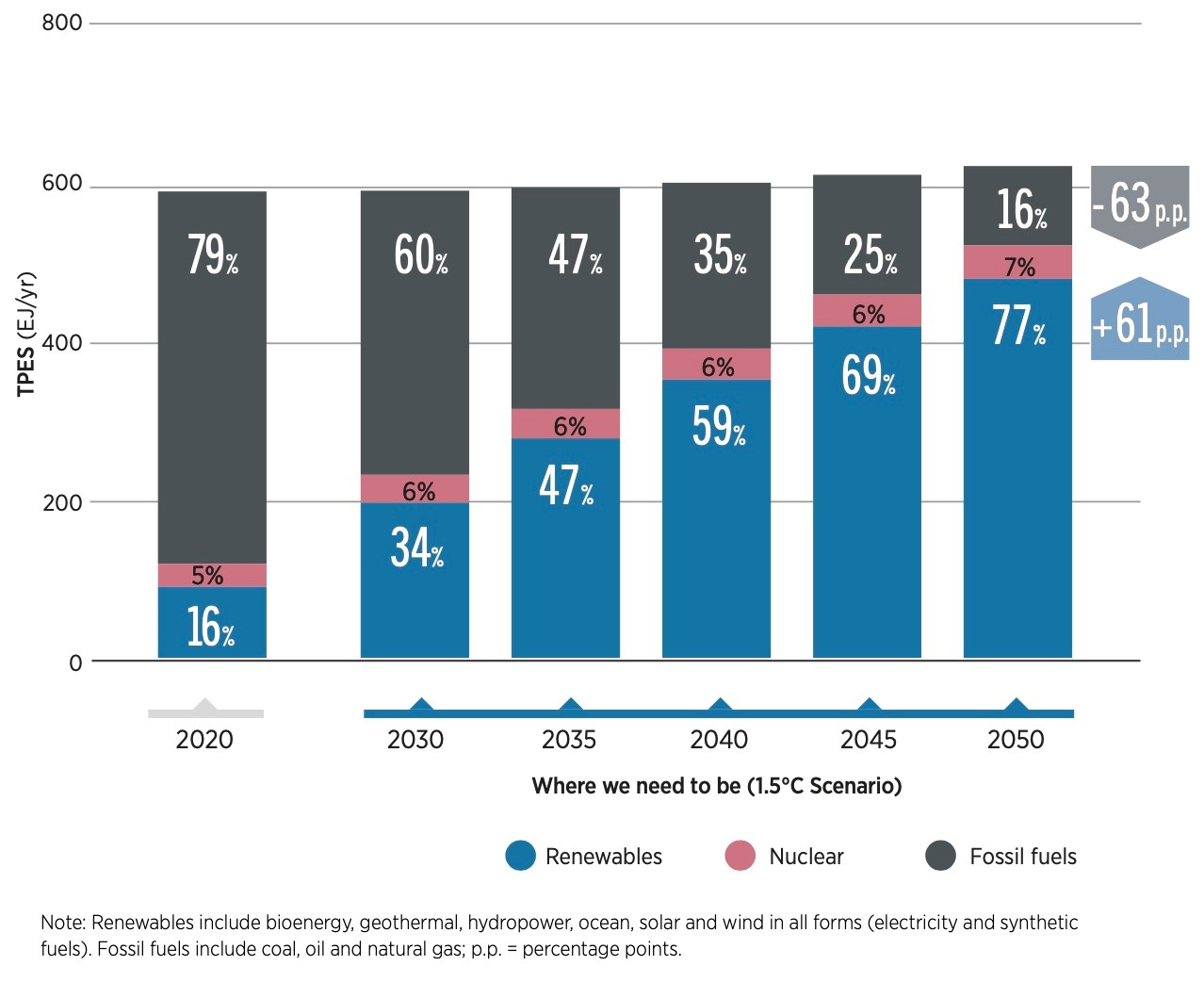 Im Jahr 2022 überstieg der Anteil der Leistung erneuerbarer Energien am Gesamtkraftwerkszubau die 80-Prozent-Marke (siehe Grafik 1). „Das ist aber die einzige positive Grafik, die ich zeige“, sagt La Camera auf der Pressekonferenz zur Eröffnung des Events, was alljährlich im Außenministerium in Berlin stattfindet und wo Politiker und Diplomaten aus aller Welt vor Ort sind. Der Zubau reiche nämlich bei Weitem nicht, um die Ziele des Paris-Abkommens zu erreichen. Bis 2030 müsse der Anteil der fossilen Energieträger von 79 Prozent 2020 auf 60 Prozent reduziert werden (Grafik 2). Dafür müsse der jährliche Zubau erneuerbarer Energien verdreifacht werden, denn ohne Erneuerbare ließen sich die Energieträger nicht ersetzen.