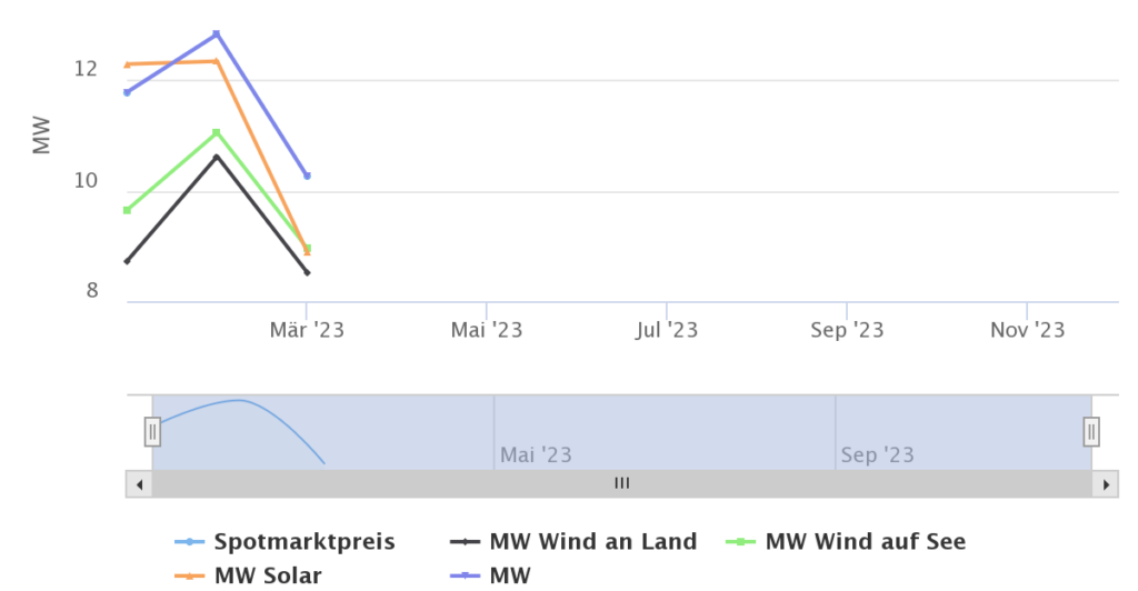 Nach den Angaben der Übertragungsnetzbetreiber auf ihrer Plattform „Netztransparenz“ gab es im März auch wieder eine Phase mit negativen Strompreisen. Dies war am 25. März vor 11 bis 17 Uhr der Fall. Auch am gestrigen Ostermontag lagen die Strompreise zwischen 12 und 17 Uhr im negativen Bereich.