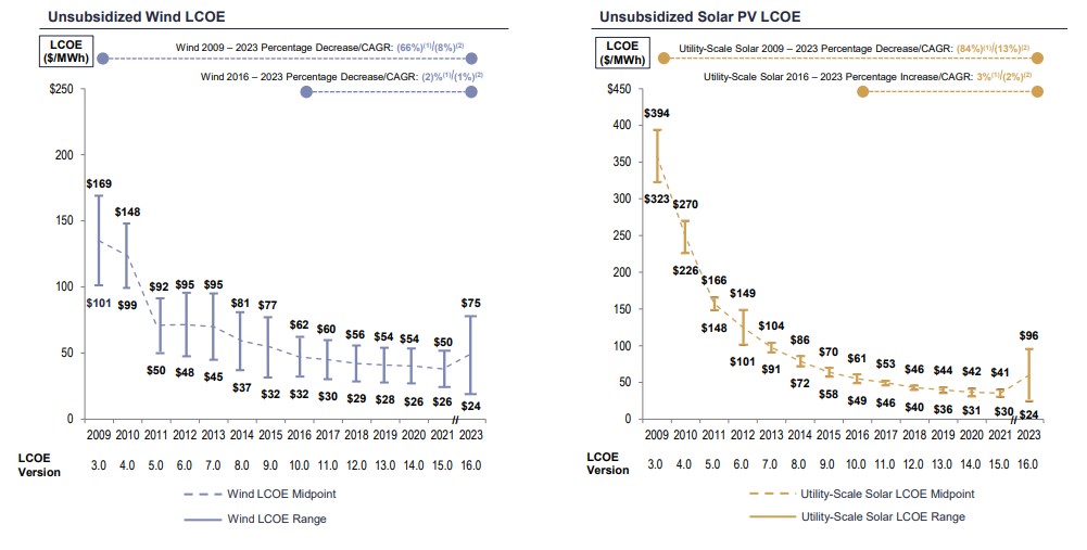 In einem Basisvergleich ohne Berücksichtigung von Subventionen, Brennstoffpreisen oder Kohlenstoffpreisen weisen die Photovoltaik- und Windkraftanlagen im industriellen Maßstab die niedrigsten Stromgestehungskosten aller Energiequellen auf. Photovoltaik-Kraftwerke liegen nach der Analyse zwischen 24 und 96 US-Dollar pro Megawattstunde, während Onshore-Windkraft die niedrigsten Stromgestehungskosten mit der kleinsten Spanne im Bereich von 24 bis 75 US-Dollar pro Megawattstunde aufweist. Die Stromgestehungskosten der Offshore-Windenergie liegen zwischen 72 und 140 US-Dollar pro Megawattstunde.