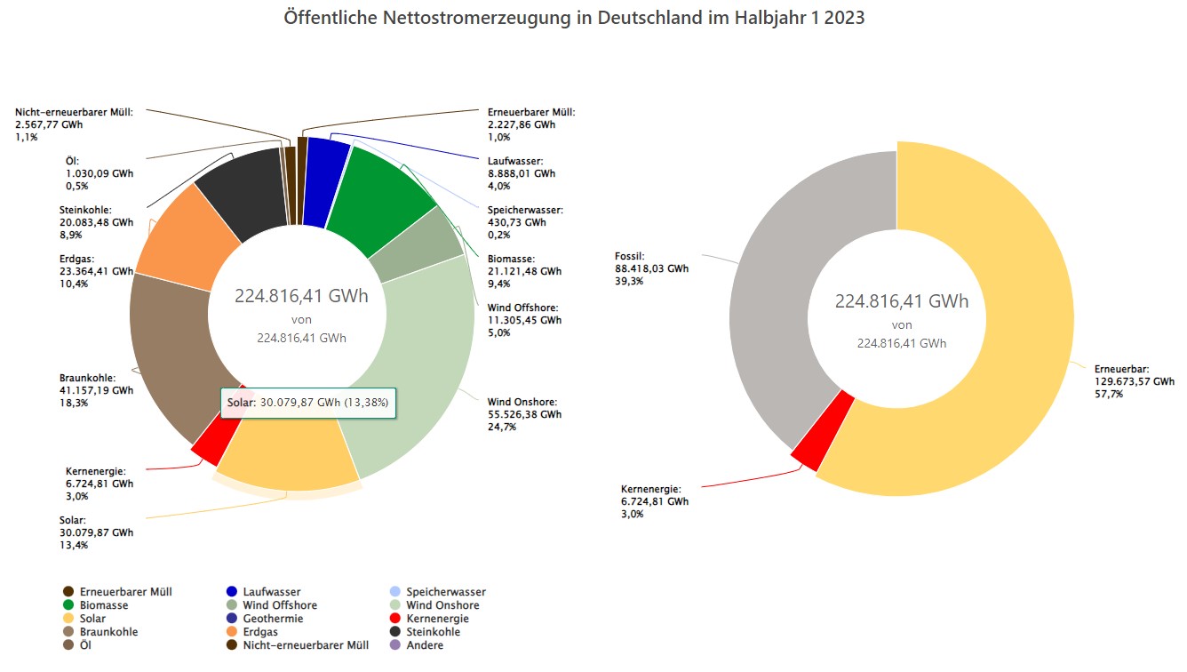 Seit der Abschaltung der letzten drei Kernkraftwerke ist Strom in Deutschland billiger und sauberer geworden. Die öffentliche Nettostromproduktion aus Braun- und Steinkohle ging um jeweils über 20 Prozent. Bei Erdgas betrug der Rückgang nur wenige Prozent. Erneuerbare hingegen legen einen Rekordwert von 57,7 Prozent bei der Nettostromerzeugung, also dem Strommix, der auch tatsächlich aus der Steckdose kommt, hin. Das geht aus den Daten zum ersten Halbjahres von Energy-Charts des Fraunhofer-Instituts für Solare Energiesystem ISE hervor.