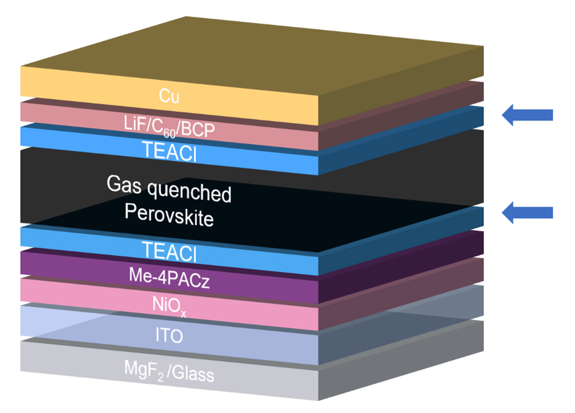 Die resultierenden oberen und dual-interface-behandelten Perowskit-Solarzellen zeigten im Vergleich zu unbehandelten Zellen eine unterdrückte nicht-radiative Rekombination, einen verbesserten Grenzflächenkontakt und eine optimierte Bandanordnung, wie die Forscher erklärten. Für die Dual-Interface-behandelten Solarzellen sei eine Spitzeneffizienz von 24,3 Prozent erreicht worden, einhergehend mit einer Kurzschlussdichte von 24,5 Milliampere pro Quadratzentimeter, einer Leerlaufspannung von 1,17 Volt und einem Füllfaktor von 84,6 Prozent.