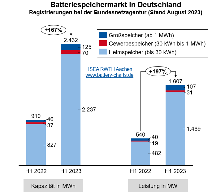 Das erste Halbjahr 2023 hatte mit fast 2,5 Gigawattstunden den höchsten Zubau des bisherigen Speichermarkts. Klar führend ist weiterhin der Photovoltaik-Heimspeichermarkt.