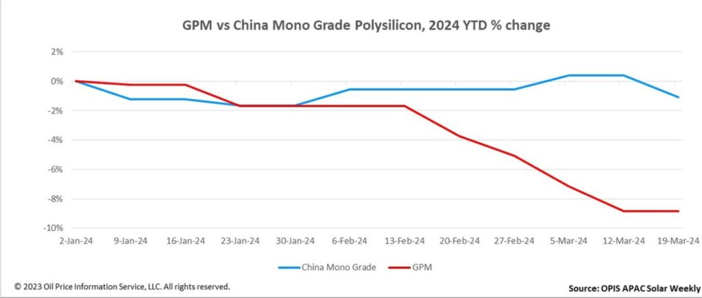 Der Global Polysilicon Marker (GPM), die OPIS-Benchmark für Polysilizium außerhalb Chinas, blieb in dieser Woche unverändert bei 23,813 US-Dollar pro Kilogramm und spiegelt damit stabile Marktgrundlagen wider. Eine mit dem globalen Polysiliziummarkt vertraute Quelle erklärte gegenüber OPIS, dass die Preise innerhalb einer angemessenen Spanne schwanken werden, da die Dynamik von Angebot und Nachfrage auf dem Polysilizium-Markt außerhalb Chinas kurzfristig keine wesentlichen Änderungen erfahren dürfte.