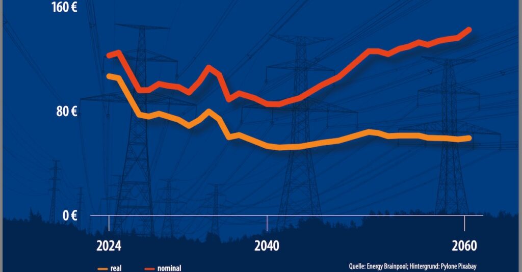 Je länger der betrachtete Zeitraum ist, umso größer ist dieser Unterschied zwischen dem nominalen Strompreis und den inflationsbereinigten Realwerten. In den Szenarien von Energy Brainpool zeigt sich schon im Jahr 2025 eine Differenz von rund einem Cent pro Kilowattstunde (siehe Grafik). Betrachtet man den gesamten Zeitraum bis zum Jahr 2050, wird der Abstand deutlich größer. Nach dem sogenannten Go-Hydrogen-Szenario von Energy Brainpool wird der Strom inklusive Inflation, also nominal, im Jahr 2040 mehr kosten als heute. Betrachtet man die Realwerte ohne eine durchschnittliche Inflation von zwei Prozent, wird er in diesem Szenario allerdings günstiger werden. 2036 liegt er real bei rund sechs Cent. Danach wird er diese Schwelle nicht mehr übersteigen.