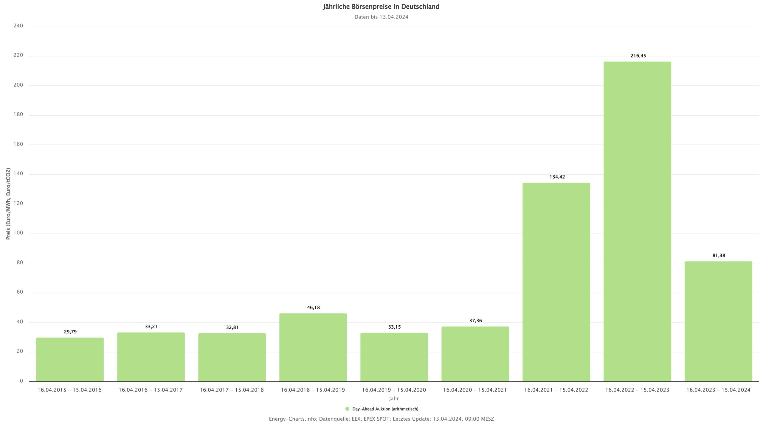 Der günstige erneuerbare Strom aus den eignen Anlagen und jenen, die grenzüberschreitend den Strom nach Deutschland geliefert haben, machte sich auch im Börsenstrompreis bemerkbar. Die Stromkosten seien mittlerweile auf dem Stand von April 2021 angelangt. Das sei niedriger als vor Russlands Angriffskrieg auf die Ukraine. Der durchschnittliche monatliche Day-ahead-Börsenstrompreis liegt bislang im April 2024 bei 4,8 Cent pro Kilowattstunde. Die Preise kommen mittlerweile auch bei den Endverbrauchern an. Bei Neukunden werden Verträge wieder mit Abschlägen auf dem Preisniveau von Juni 2021 abgeschlossen.