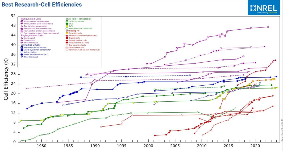 „Alles bis Ende 2023 ist enthalten“, sagte ein Sprecher des Forschungsinstituts des US-Energieministeriums auf Anfrage von pv magazine. Er wies darauf hin, dass die Tabelle auch wichtige Ergebnisse aus dem ersten Quartal dieses Jahres enthält. „Das Format des Diagramms wird sich bald ändern, um auch hybride Tandemzellen zu berücksichtigen.