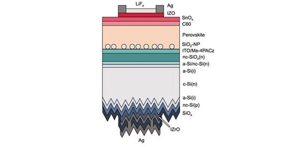 Das Team baute die Top-Zelle mit einem Substrat aus Indium-Zinn-Oxid (ITO), einer Lochtransportschicht (HTL) auf der Basis von Siliziumdioxid (SiO2)-Nanopartikeln und Phosphonsäure namens methylsubstituiertes Carbazol (Me-4PACz), einem Perowskit-Absorber, einer ETL auf der Basis von Buckminsterfulleren (C60), einer Pufferschicht aus Siliziumoxid (SiO2)-Nanopartikeln (NPs), einem transparenten Kontakt auf der Basis von Indiumzinkoxid (IZO) und einem Metallkontakt aus Silber (Ag).