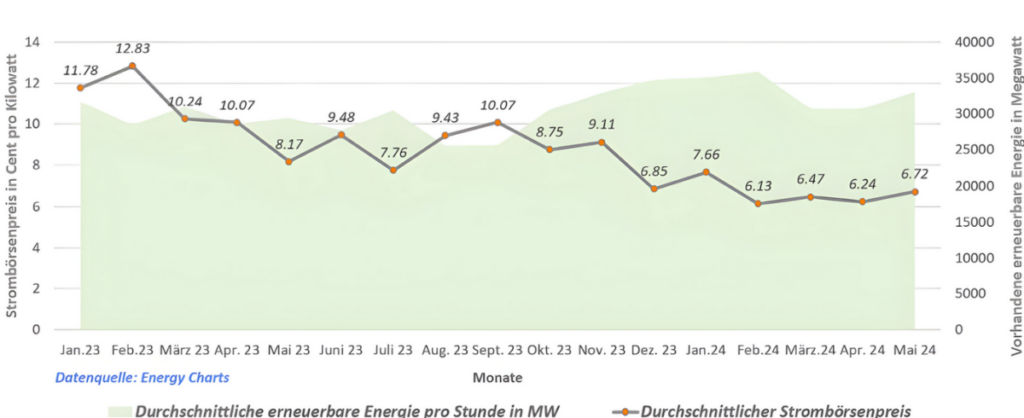 Im Mai wurde an der Strombörse im sogenannten Day-ahead-Markt (Transaktionen für den jeweiligen Folgetag) für die Region Deutschland/Luxemburg ein Durchschnitt von 6,72 Cent je Kilowattstunde erzielt. Dies berichtet Rabot Charge, ein Anbieter dynamischer Stromtarife, unter Berufung auf die „Energy-Charts“ des Fraunhofer-Instituts für Solare Energiesysteme. Die von der Strombörse Epex Spot selbst vorgenommene monatliche Auswertung liegt noch nicht vor, sie deckt sich aber für gewöhnlich stets mit den Energy-Charts.