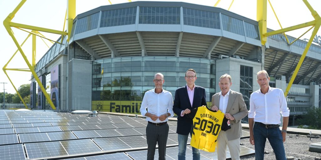 Die ersten Solarmodule auf dem Stadiondach von Borussia Dortmund hat im Jahr 2011 die damalige Q-Cells SE montiert – mit insgesamt 920 Kilowatt Leistung. Am Donnerstag teilten RWE und der Fußball-Erstligist mit, diese Anlage zu erneuern und deutlich zu erweitern. Als Teil einer sechsjährigen Zusammenarbeit wird RWE als „Premium- & Nachhaltigkeitspartner“ mehr als 9500 neue Solarmodule mit zusammen rund 4,2 Megawatt Leistung installieren. Ergänzt wird das Projekt mit einem Batteriespeicher mit 3,4 Megawattstunden Kapazität.