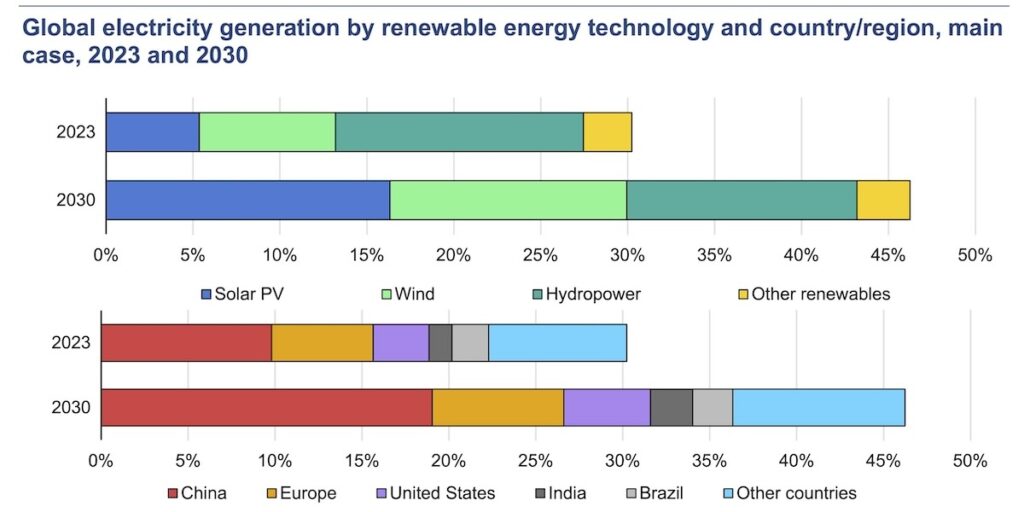 Die Internationale Energieagentur IEA erwartet für das Jahr 2030 einen Anteil erneuerbarer Energien an der weltweiten Stromerzeugung von „annähernd der Hälfte“, genauer: 46 Prozent. Die Erneuerbaren werden demnach „so schnell ausgebaut – sie übertreffen die von den Regierungen selbst gesetzten Ziele“. Zumindest für viele Länder trifft dies zu, resümiert die IEA in ihrem aktuellen Bericht „Renewables 2024“. An die 70 Staaten, die gemeinsam für 80 Prozent der weltweiten Stromerzeugungskapazität aus erneuerbaren Energien stehen, werden ihre jeweiligen Ziele bis 2030 erreichen oder übertreffen.