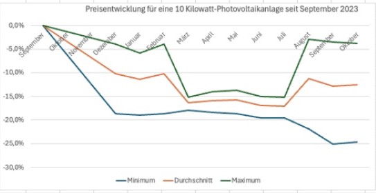 „Die günstigsten Angebote für eine Photovoltaik-Anlage mit zehn Kilowatt Leistung ohne Speicher liegen demnach bei knapp über einem Euro pro Kilowatt, die teuersten bei etwa zwei Euro pro Kilowatt.“