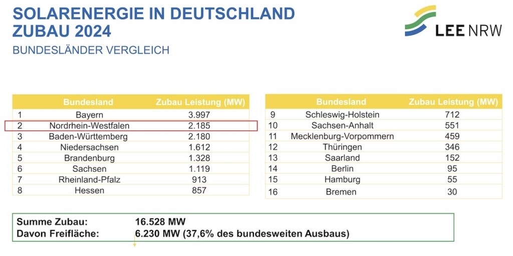 Der Landesverband Erneuerbare Energien Nordrhein-Westfalen (LEE NRW) fordert die Regierung des Bundeslands auf, sich im Bundesrat für ein „standortgerechtes Vergütungsmodell“ einzusetzen, „wie es bei der Förderung der Windenergie in Deutschland seit vielen Jahren praktiziert wird“. Dies sei nötig, „um die höheren Sonneneinstrahlungswerte in Süddeutschland auszugleichen“. Der Verband verweist hierbei auf den sogenannten Korrekturfaktor für Windkraftanlagen an Binnenlandstandorten, der das in Küstenregionen deutlich höhere Windaufkommen kompensieren soll. Allerdings sind die standortbedingten Ertragsunterschiede hierbei ungleich größer als bei Photovoltaik-Anlagen. Hintergrund für den Vorschlag, der so oder ähnlich schon früher von verschiedenen Akteuren ins Gespräch gebracht wurde, ist die vom LEE NRW am Freitag vorgelegte Bilanz zum Photovoltaik-Zubau 2024.