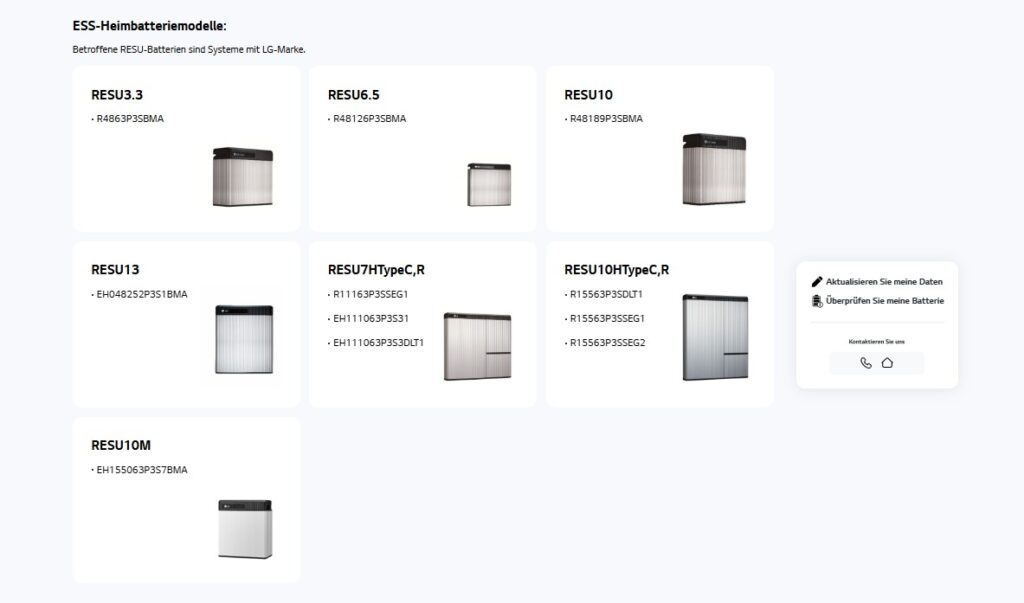 Zur Überprüfung, ob die im eigenen Haus verbauten Batteriespeicher von der Rückrufaktion betroffen sind, bietet LG einen Online-Seriennummern-Check an. Wenn die Photovoltaik-Heimspeicher unter die Tauschaktion fallen, müssen sich die Kunden über die Website registrieren. Sofern Sie bereits registriert seien, ist eine Telefonnummer für weitere Details zum Ablauf angegeben. Dieses Vorgehen betrifft auch den Rückruf der Diagnose-Software, die LG auf seinen Photovoltaik-Heimspeichern aufgespielt hat und die ebenfalls fehlerhaft scheint.
