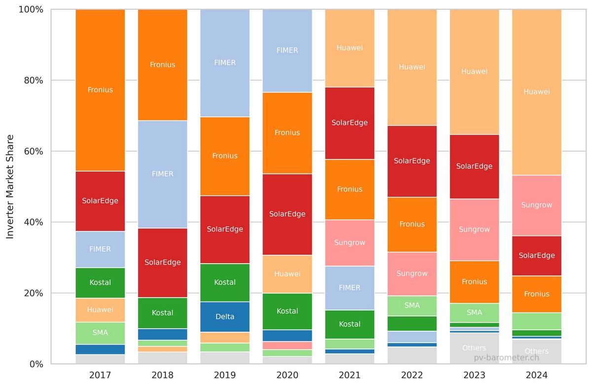 Bei Wechselrichtern dominierte Huawei 2024 den Markt mit einem Anteil von knapp 50 Prozent. Dahinter folgen Sungrow, Solaredge, Fronius und SMA. Der Marktanteil der europäischen Hersteller ist von 80 Prozent in 2020 auf 40 Prozent gesunken.