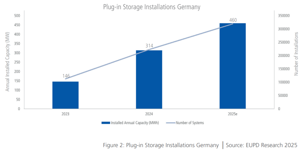 So sind immerhin bereits rund 220.000 neue Batteriespeicher in Kombination mit steckerfertigen Photovoltaik-Anlagen im vergangenen Jahr installiert worden. Dies sei ein Zuwachs von rund 97 Prozent gegenüber 2023. In rund 90 Prozent der Fälle wird der Batteriespeicher dabei direkt mit der neuen Photovoltaik-Anlage verbaut. Für dieses Jahr wird mit einem weiteren Anstieg auf mehr als 300.000 neue Speicher zu Stecker-Solar-Geräten gerechnet.